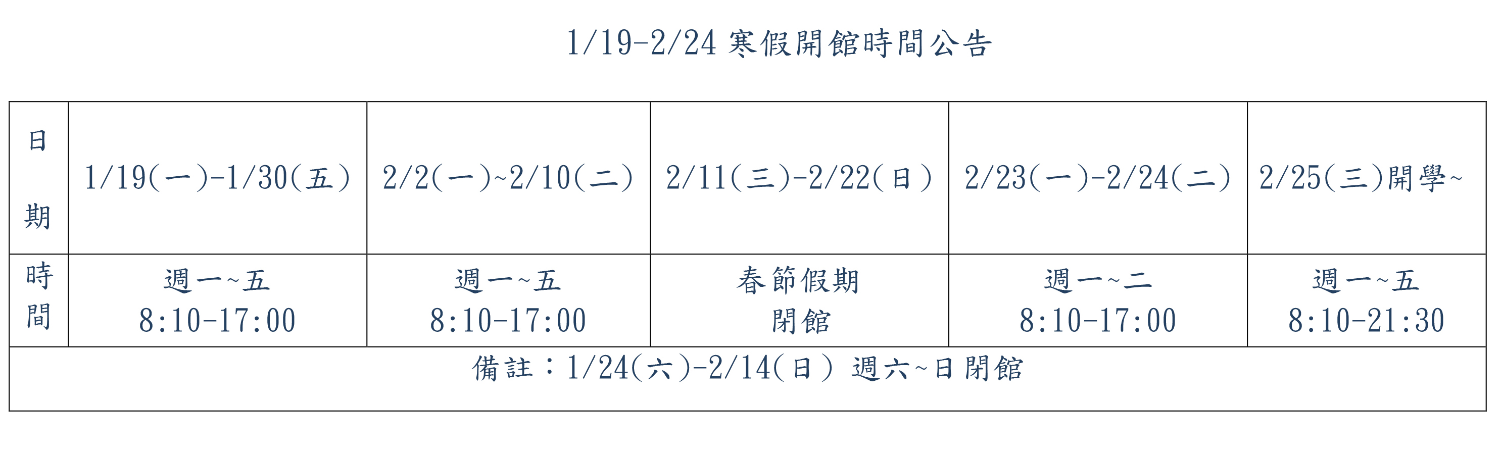 配合寒假來臨,115年01月19日(星期一)至115年02月24日(星期二)止,圖書館寒假開館時間如下表: