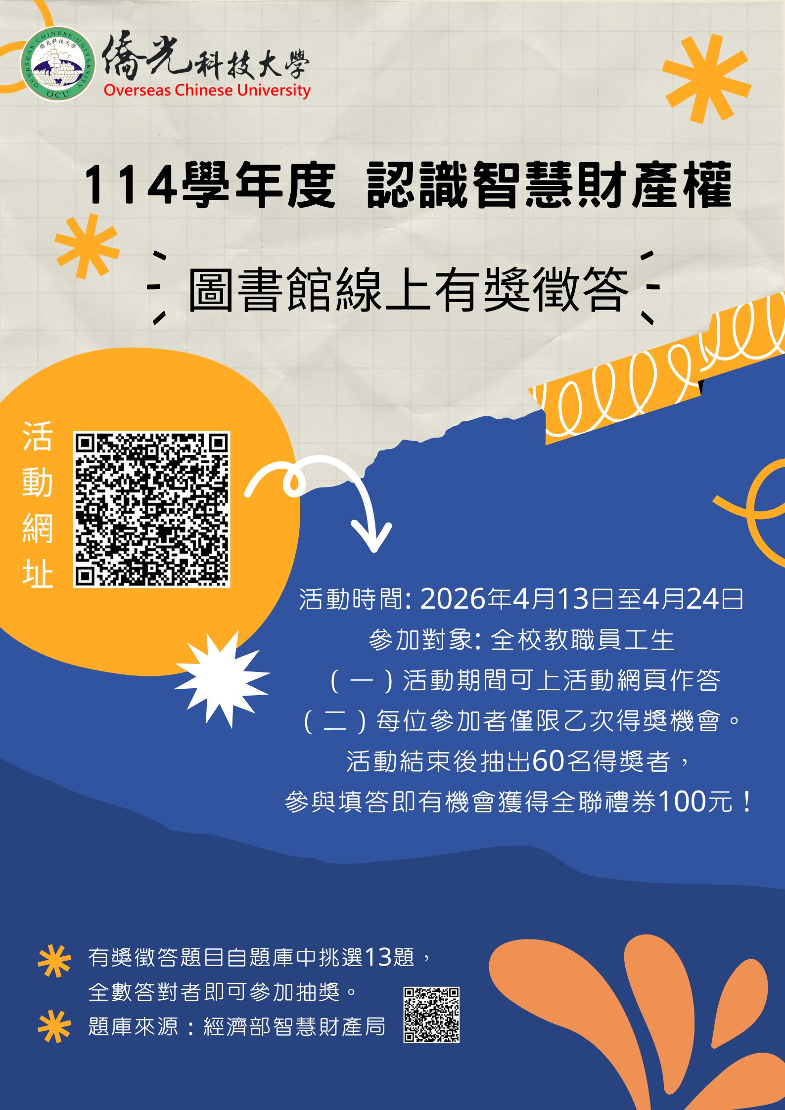 圖書館於4/13-4/24舉辦智慧財產權線上有獎徵答活動,