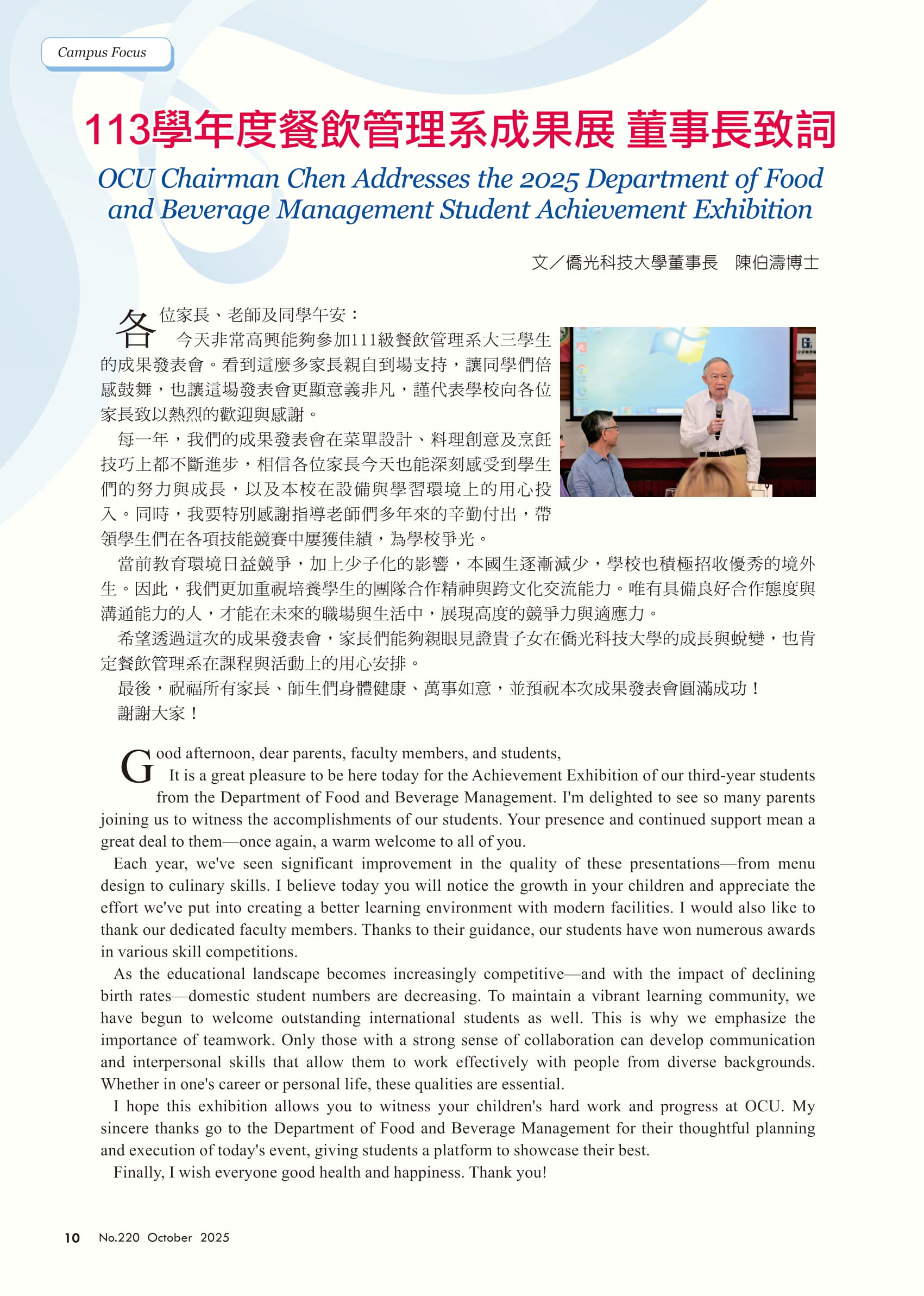 113學年度餐飲管理系成果展 董事長致詞 OCU Chairman Chen Addresses the 2025 Department of Food and Beverage Management Student Achievement Exhibition